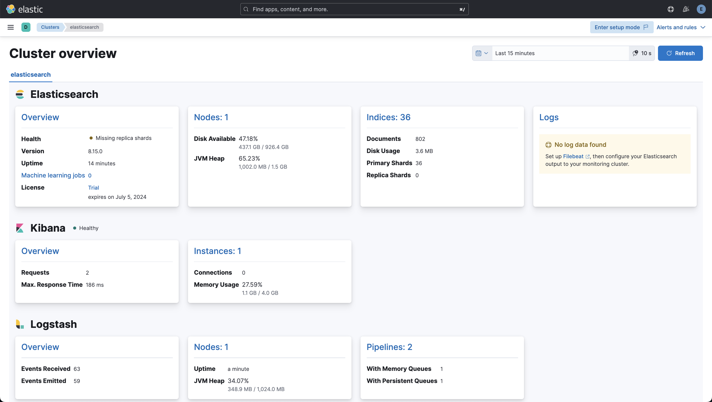 To verify your monitoring configuration, point your web browser at your Kibana host, and select Stack Monitoring from the side navigation. If this is an initial setup, select set up with self monitoring and click Turn on monitoring. Metrics reported from your Logstash nodes should be visible in the Logstash section. When security is enabled, to view the monitoring dashboards you must log in to Kibana as a user who has the