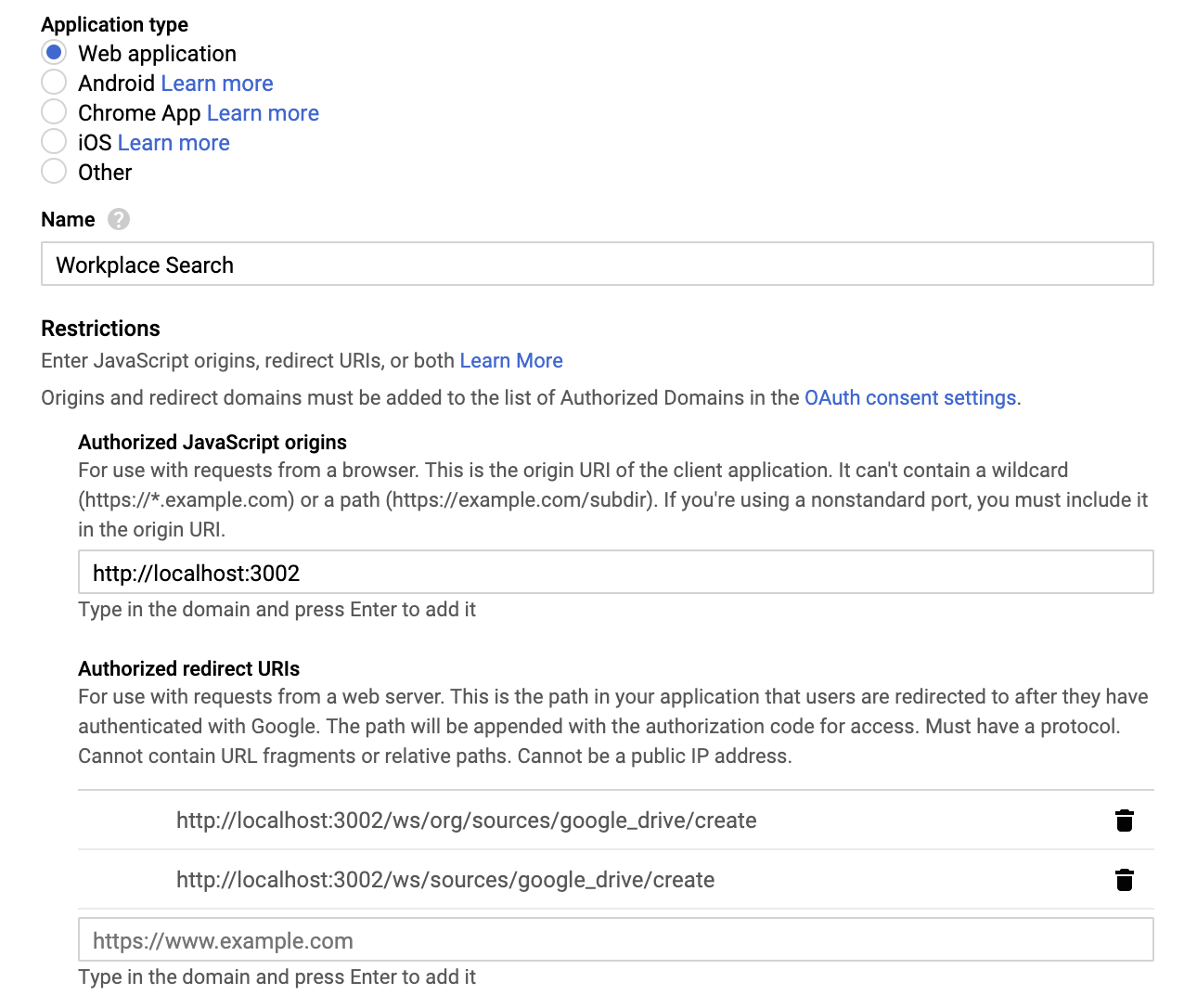 Authorized JavaScript origins: The base URL at which Workplace Search is hosted (scheme + host, no path).