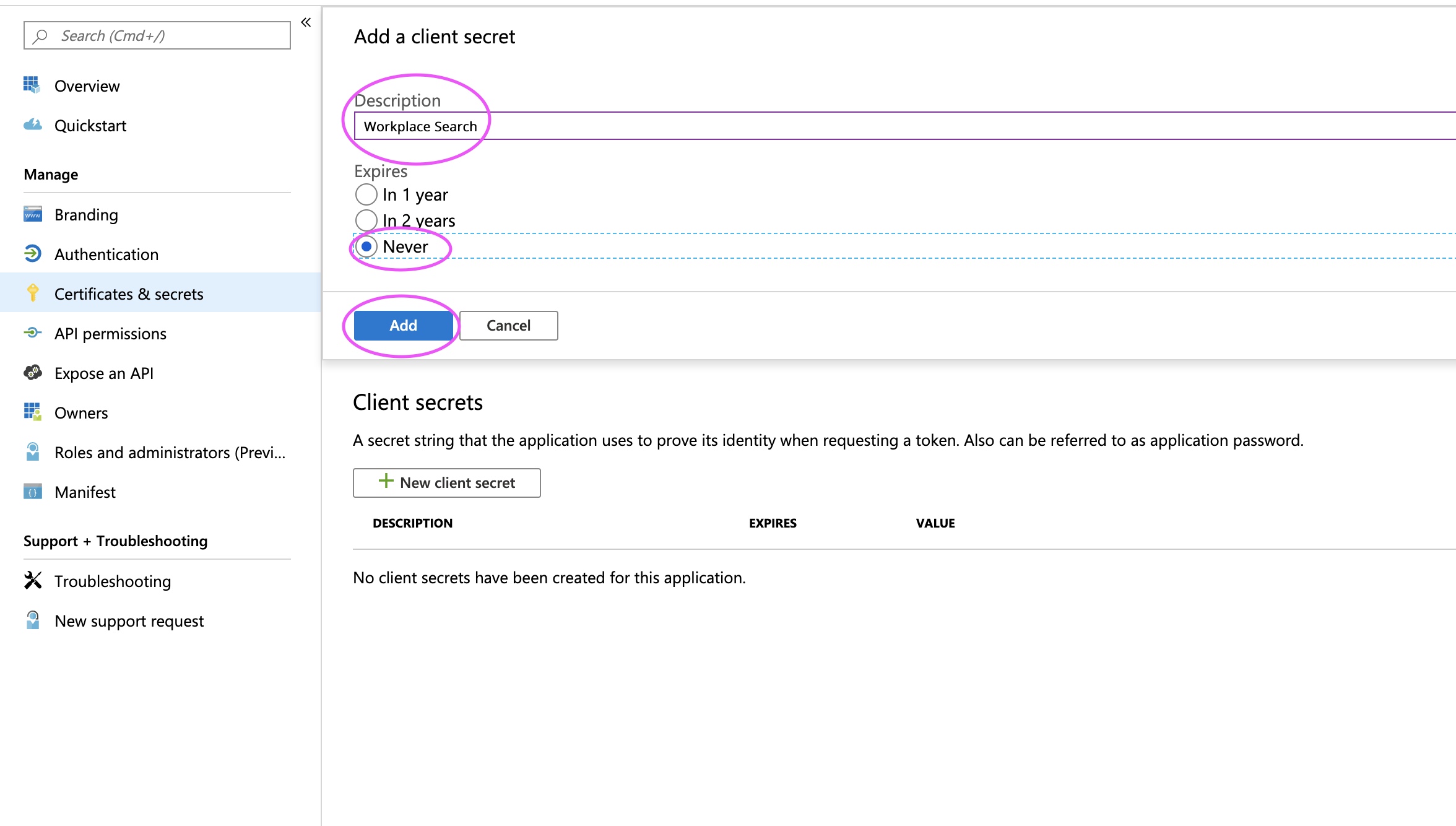 Step 9. Pick a name for your client secret (for example, Workplace Search). Select Never as the expiration date: