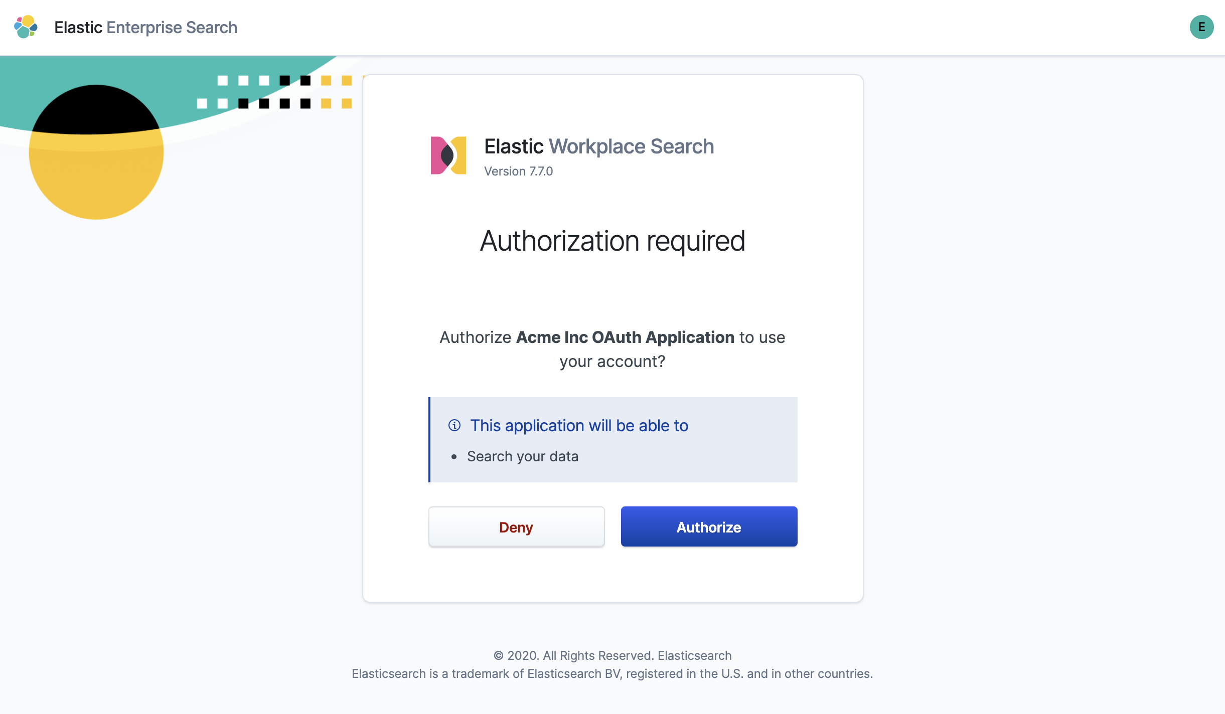 editThe first step towards designing and implementing a custom search experience for Workplace Search is to create an OAuth application from the administrative dashboard. This OAuth application will ensure proper authentication of users and secure access to content.