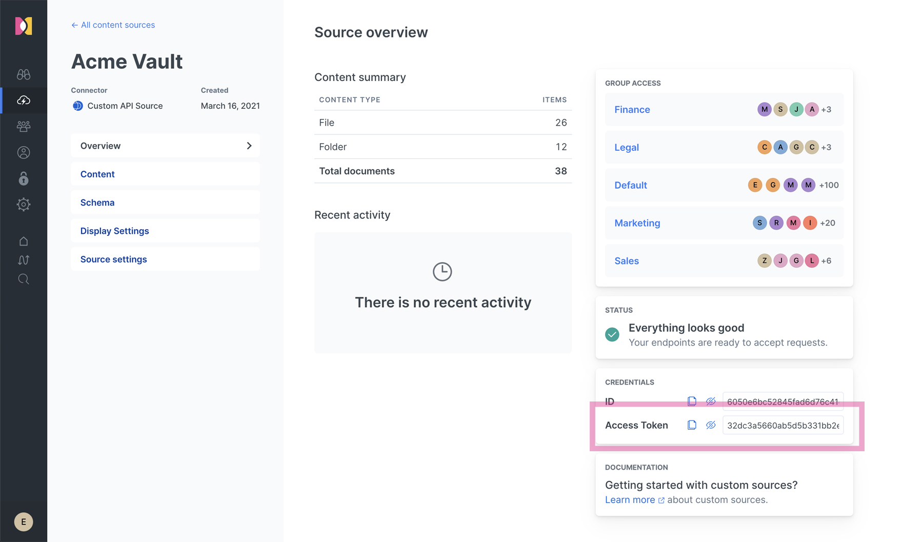To locate the access token for the logged-in admin user, navigate to the Details area of an existing Content Source that uses document-level permissions, such as Custom API Sources: