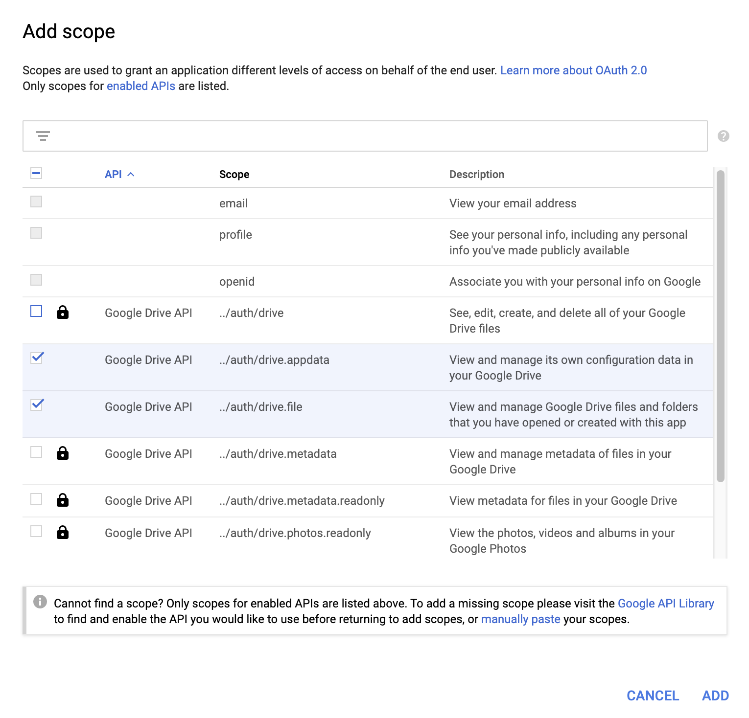 Step 10. In the Scopes for Google APIs section, click Add scope and select the following scopes for the Google Drive API: