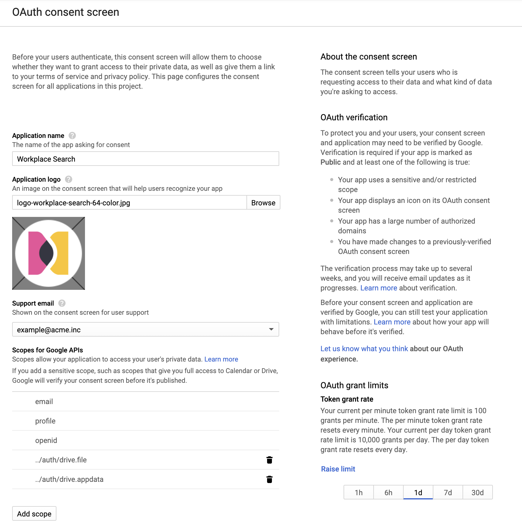 editConfiguring the Google Drive connector is the first step prior to connecting the Google Drive service to Workplace Search, and requires that you create an OAuth App from the Google Drive platform.