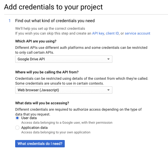 Step 6. Select Google Drive API as the API you are using. You will call it from Web browser to access User data: