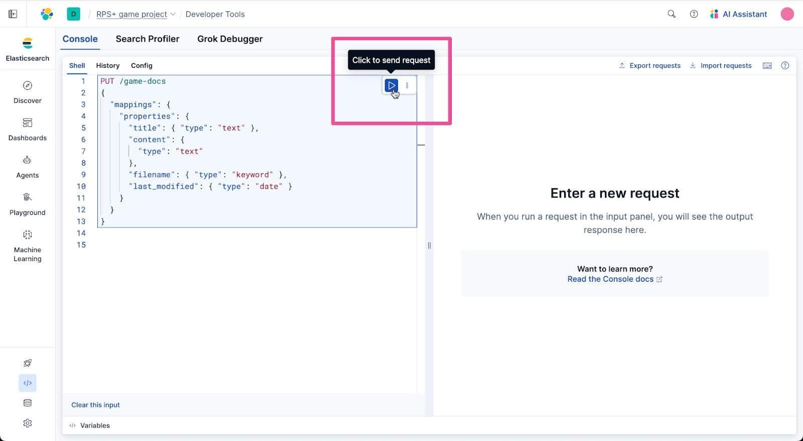 Copy and paste the following PUT command into the request input area of the Developer Tools console. This statement creates an Elasticsearch index named “game-docs”.