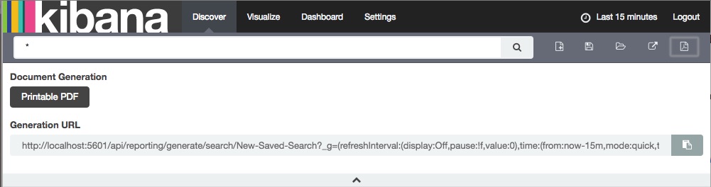 http://localhost:5601/to open Kibana. The Generate Report button is added to the Toolbar: