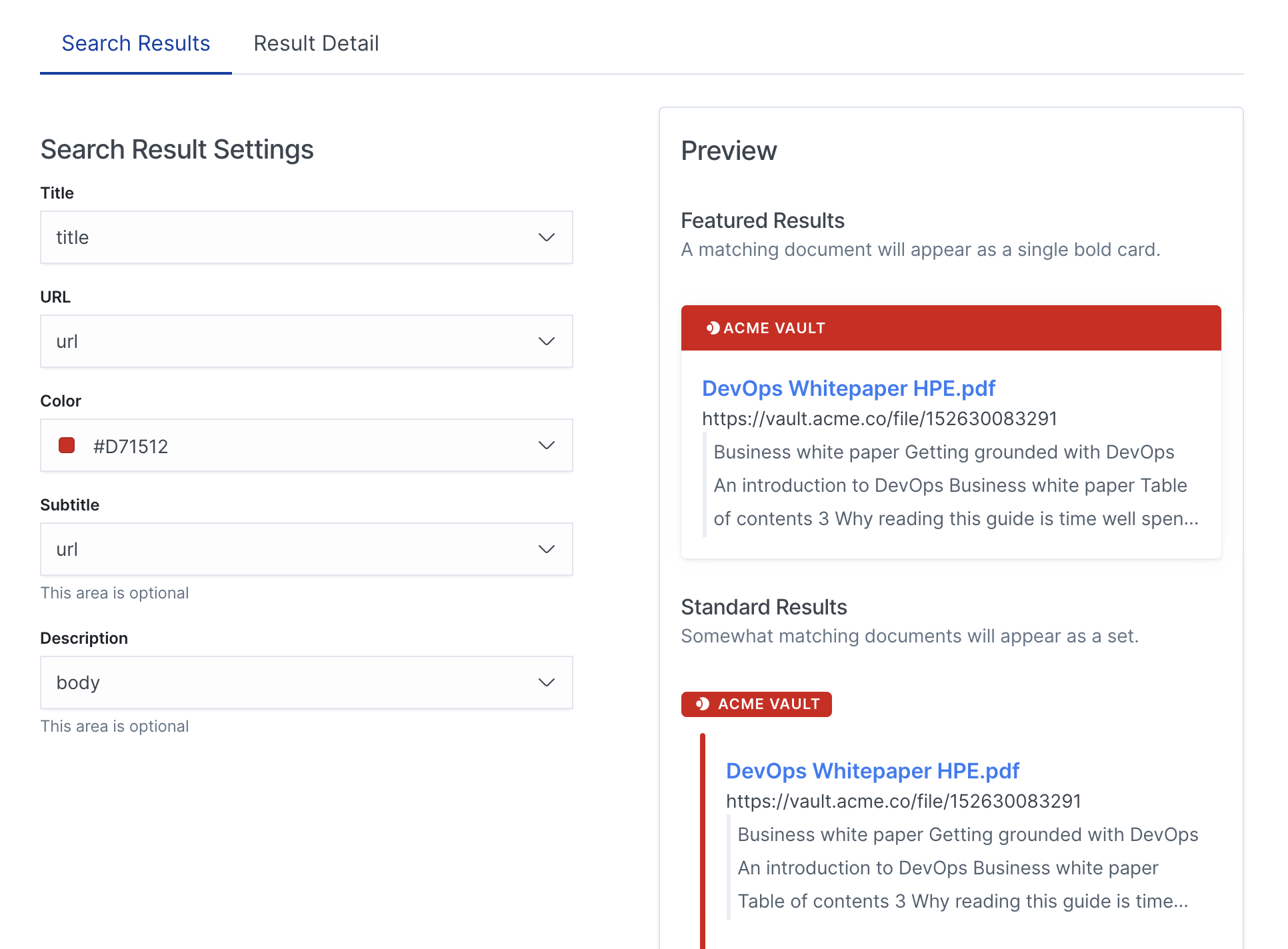 Standard Result: a result as it appears on the main results page Featured Result: usually a direct match on a search term, with high precision Details View: the panel that appears upon clicking a result, which provides a quick view of the document and may provide enough information from the search experience itself