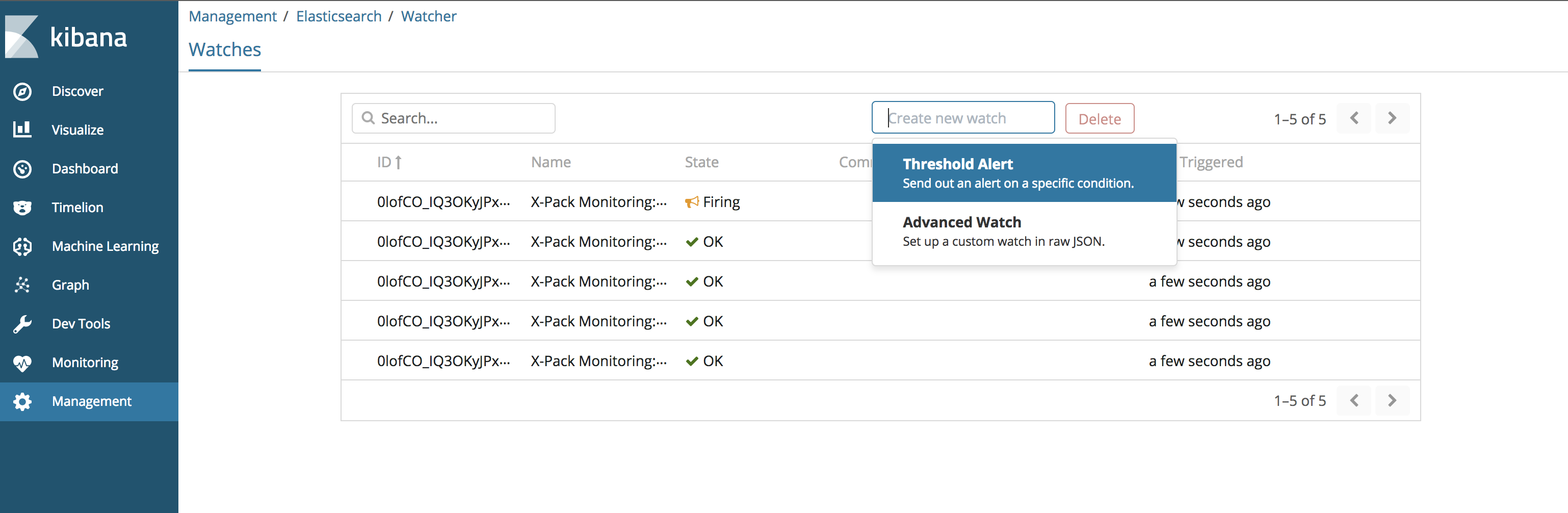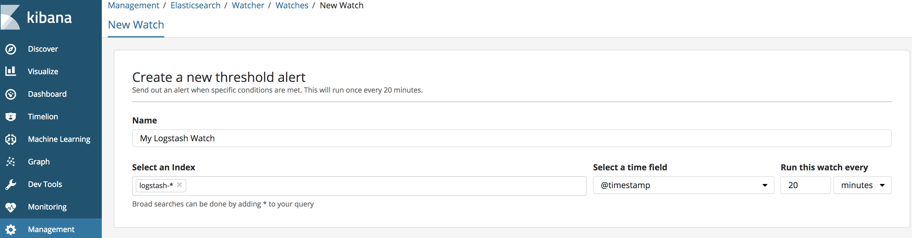 editYou can create a threshold alert to periodically check when your data goes above or below a certain threshold within a given time interval. It’s one of the most common type of alerts that you can create using Watcher. For more advanced watches, see the Create Advanced Watch.