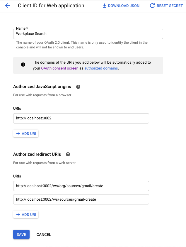 Authorized JavaScript origins: The base URL at which Workplace Search is hosted (scheme + host, no path).