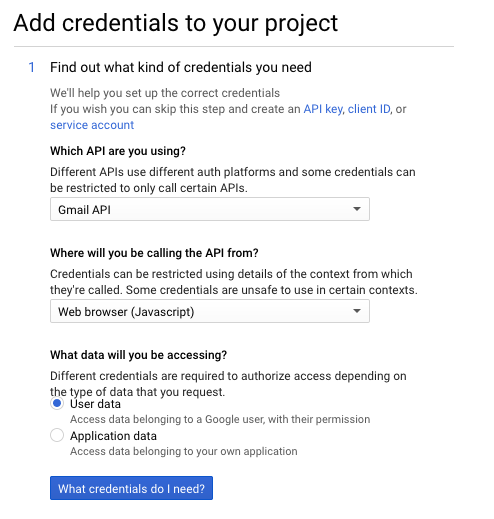 Step 2. We must first create a project, and then add access to the Gmail API to it. Click Create when prompted: