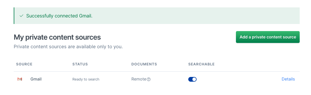 editOnce the Gmail connector has been configured, you may connect a Gmail instance to your private search experience.