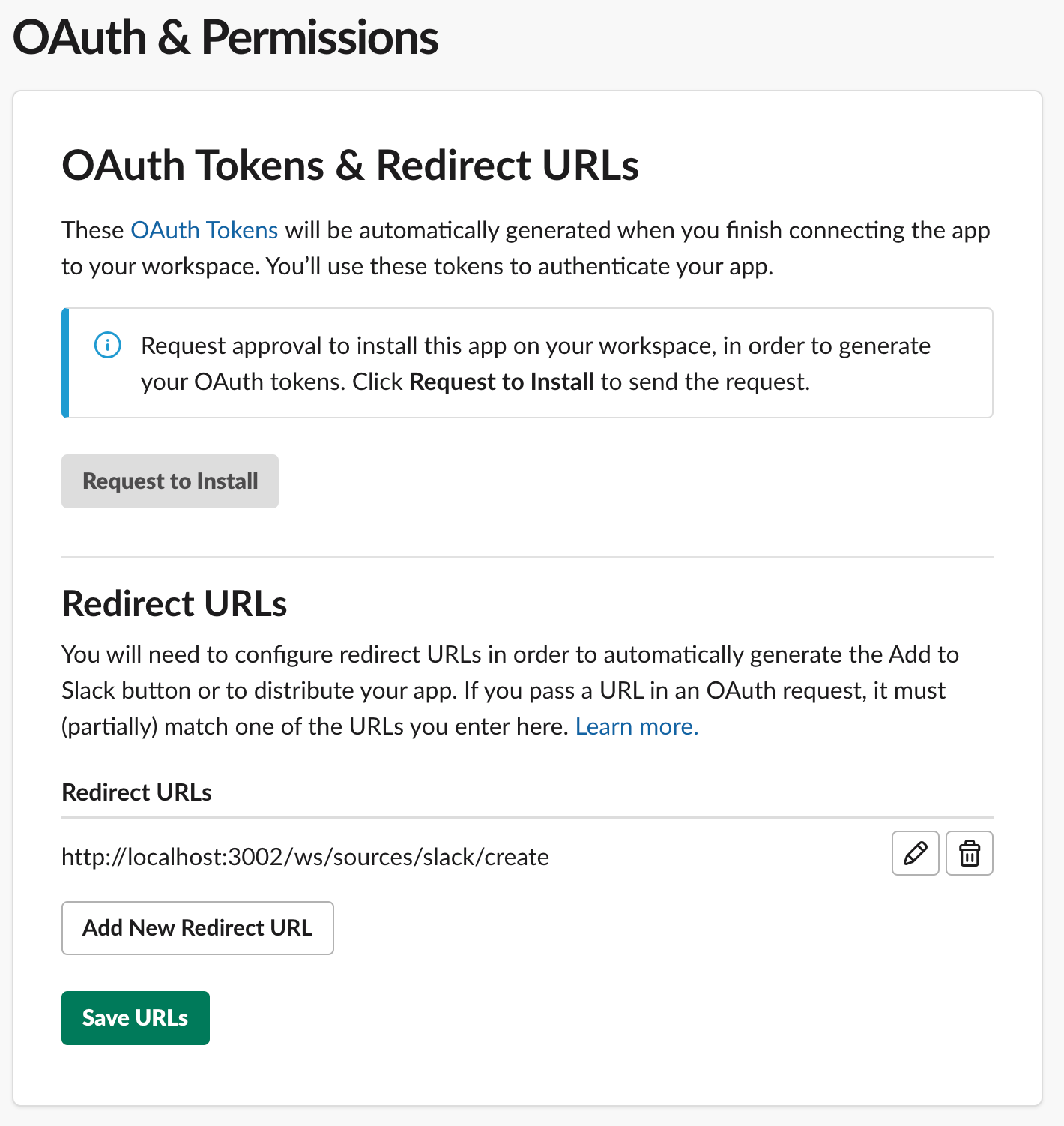 Step 4. Provide a redirect URL. You will need to ensure the URL is relative to your deployment. If you were setting it up on your local machine, you would use: http://localhost:3002/ws/sources/slack/create. After you have added it, click Save URLs.