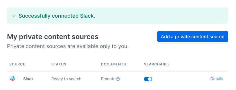 Remote sources like Slack are private sources. Once you have configured the connector, each individual member must add it as a unique private source via their personal settings. The connecting person can access their own private channels and direct messages, and only they have access. Each member may connect only one Slack private content source.