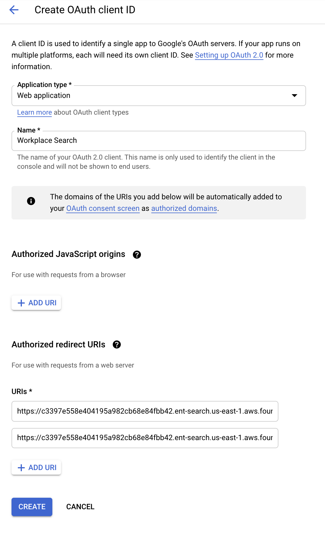 Authorized redirect URIs: The redirect URIs for your Workplace Search installation.