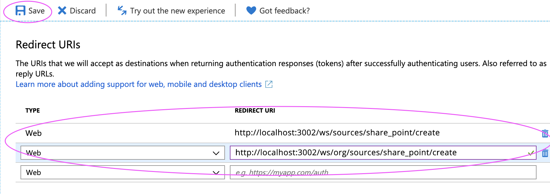 When using standalone Enterprise Search, add the following two redirect URIs, substituting <WS_BASE_URL> with the base URL at which Workplace Search is hosted (scheme + host, no path).