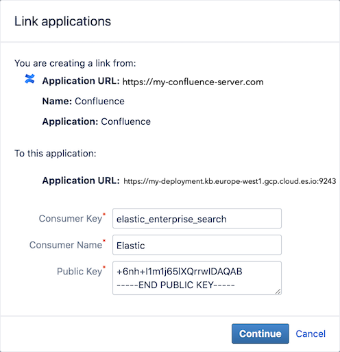 editStep 1. From the Workplace Search administrative dashboard’s Sources area, locate Confluence Server and click Configure. You are presented with a Public Key and a Consumer Key. Copy these keys and keep them handy, as we’ll need them in just a second.