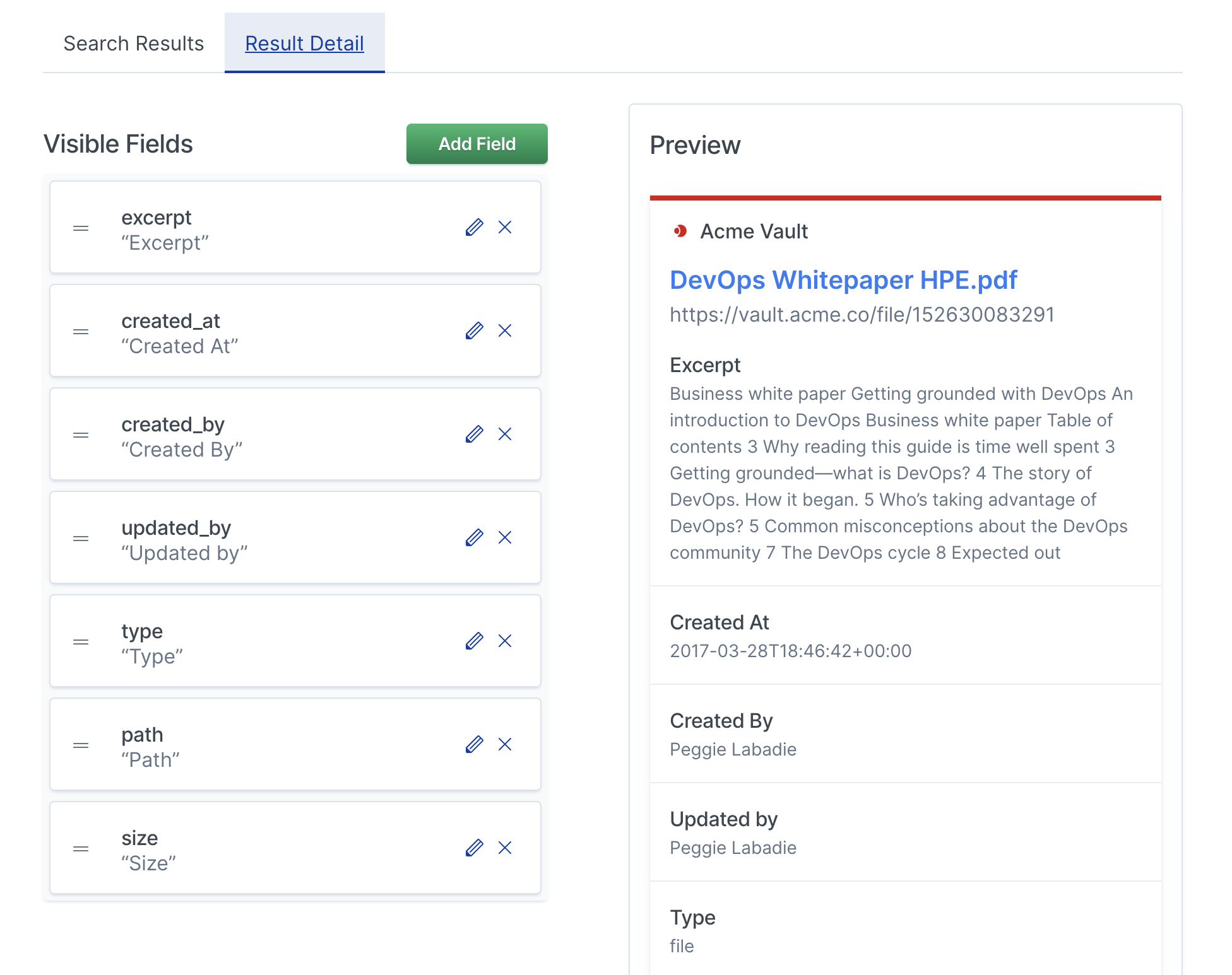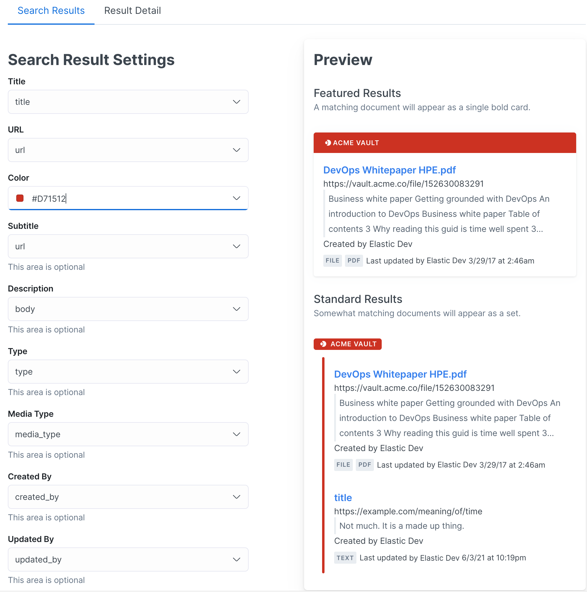 editDisplay Settings bring your documents to life with proper information architecture and evocative color schemes. To create a search experience that’s both relevant and easy to use, Workplace Search lets you adjust the visual representation of two types of results and their details view: