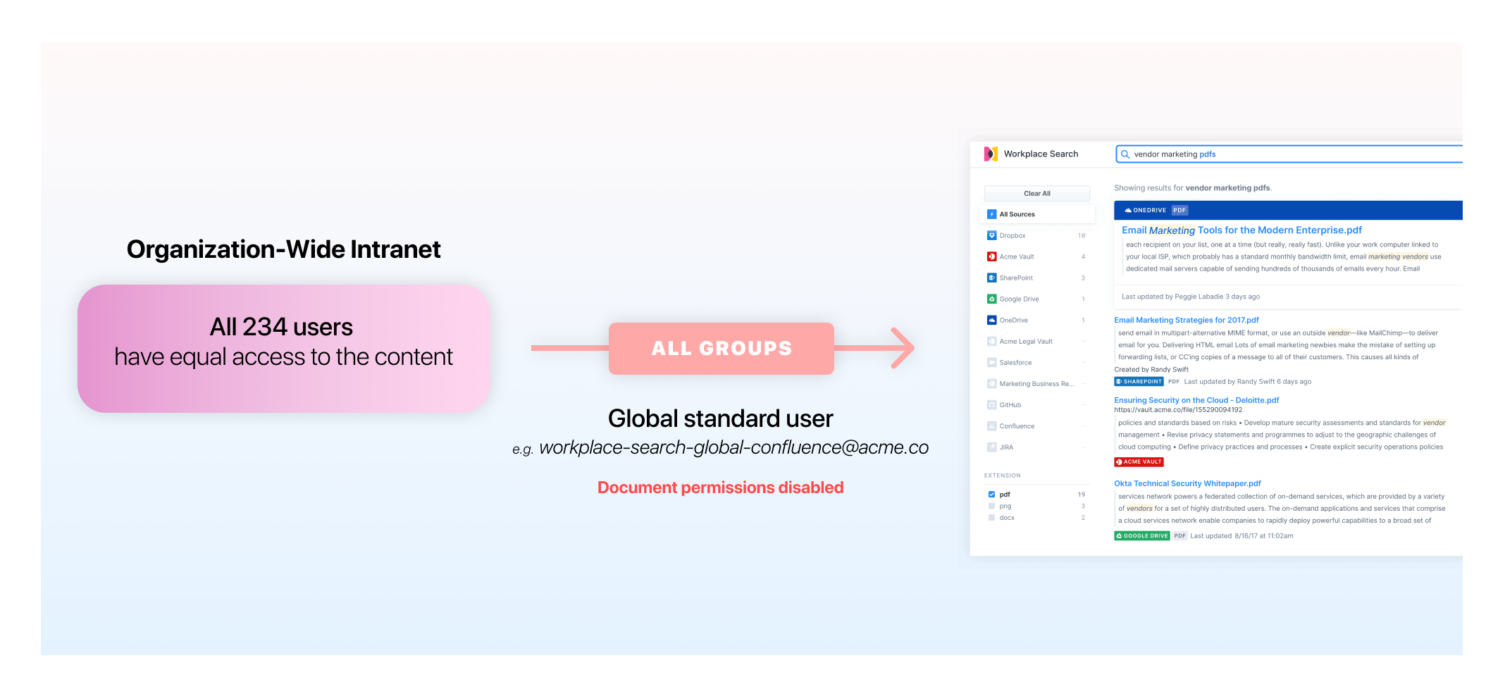 If your organization uses a platform like Confluence to power internal knowledge sharing via an Intranet-style portal, you could choose to create a user with access limited to all global spaces and articles, which should represent most of the information available on the platform. Concretely, this means using the Confluence integration provided with Workplace Search, with document permission synchronization turned off, and access granted via a [email protected] standard user. All information available will be made searchable as is to all users of the Workplace Search platform.