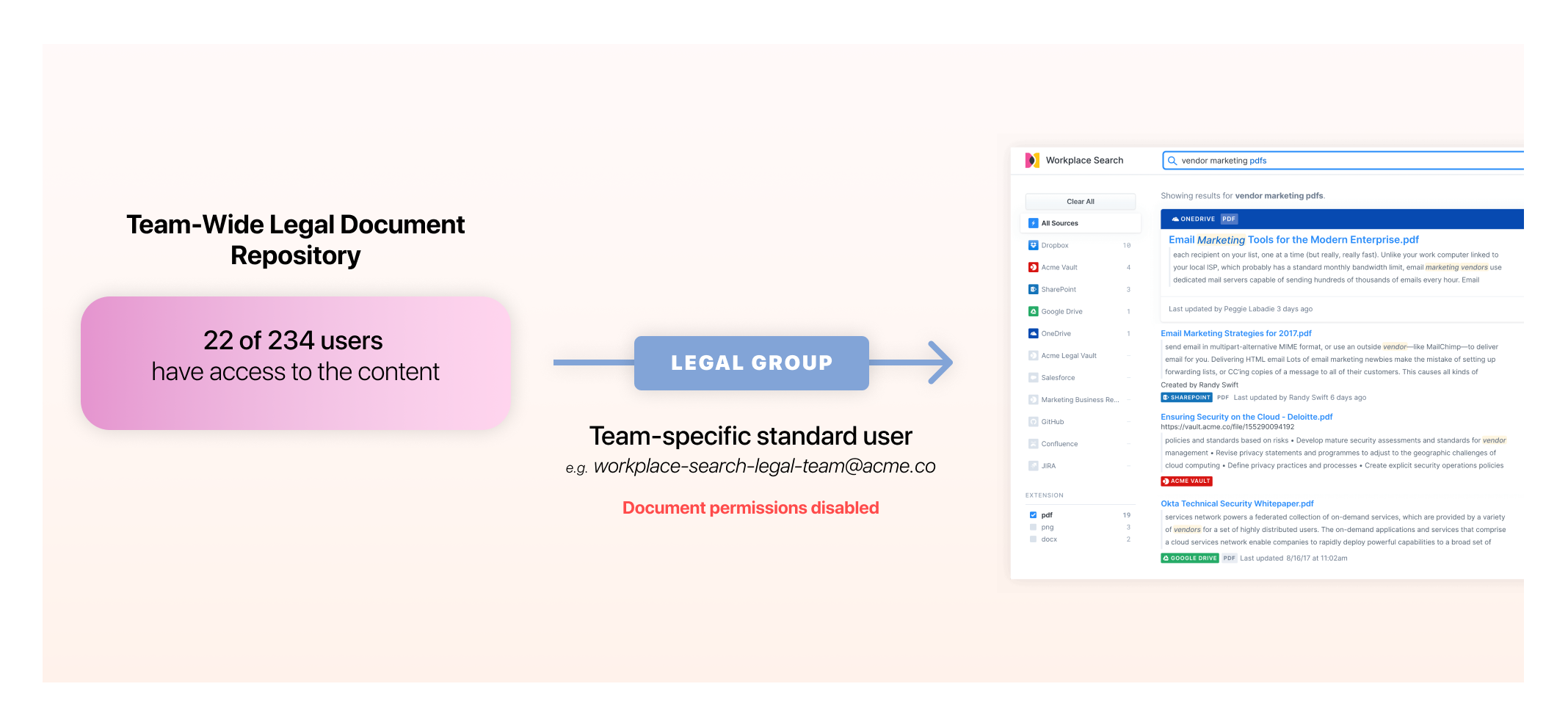 - A standard user of the platform being connected, with restricted access to certain documents — in general mapping exactly with the group structure at the Workplace Search level.