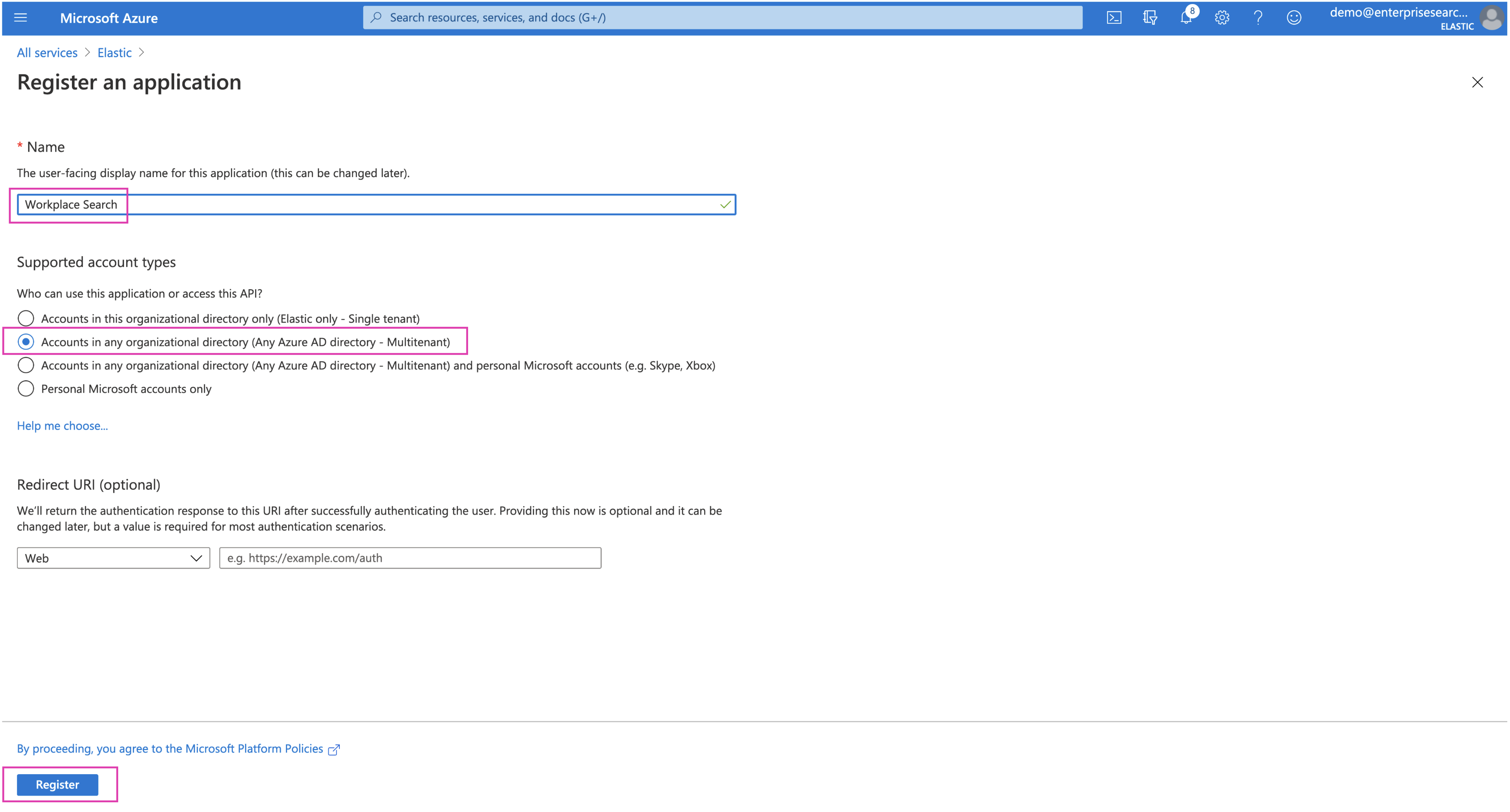Give your app a name - like "Workplace Search", make it multitenant and click Register.