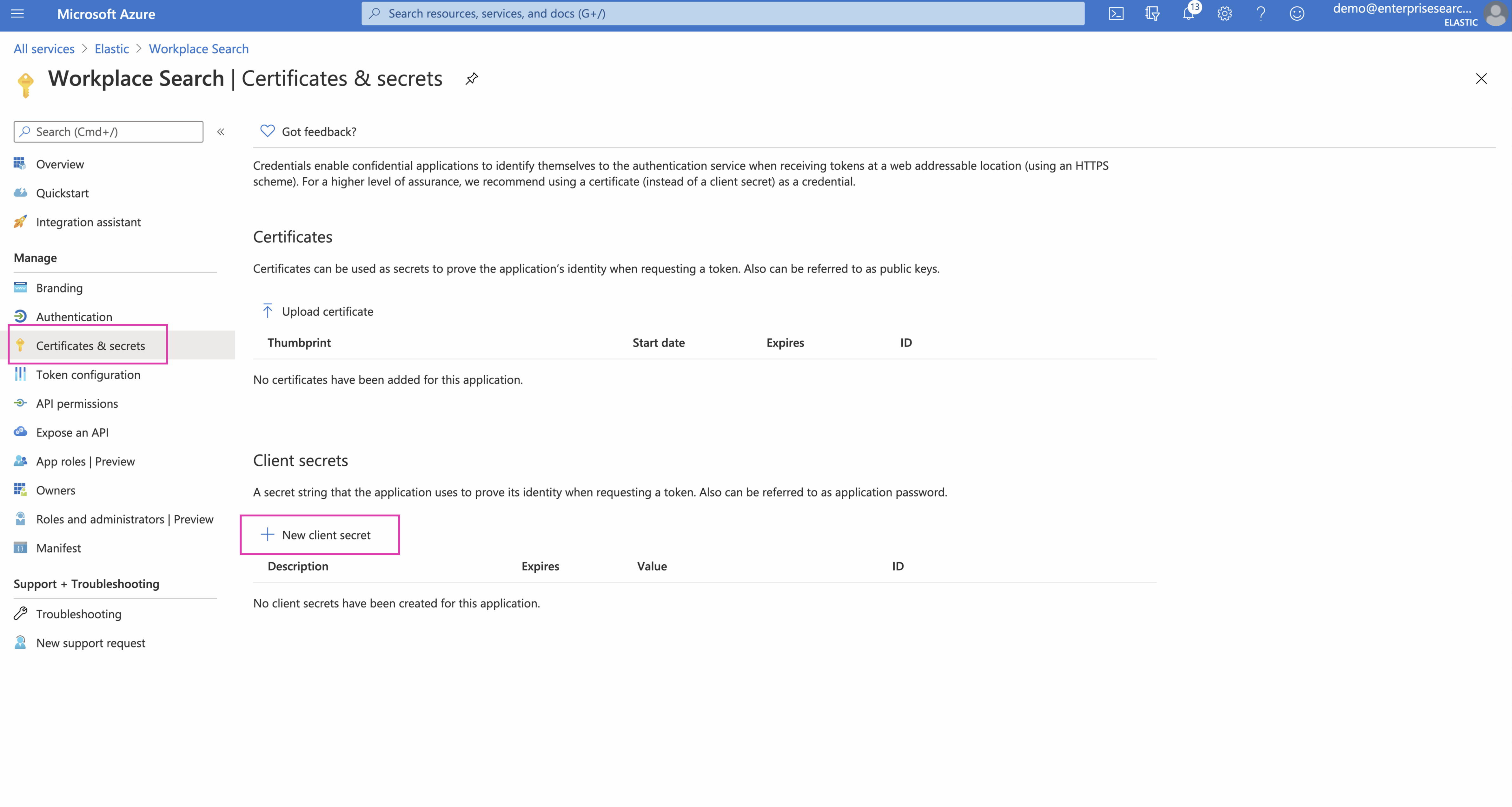 Step 8. Navigate to Certificates & Secrets and then click New client secret:
