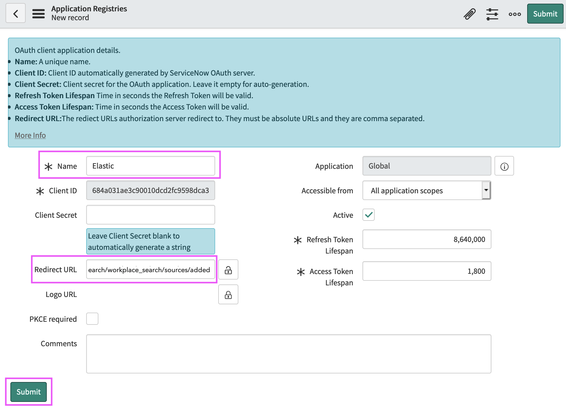 Step 6. From the Workplace Search administrative dashboard’s Sources area, locate ServiceNow and provide both the Client ID and Client Secret. Voilà! The ServiceNow connector is now configured, and ready to be used to synchronize content. In order to capture data, you must now connect a ServiceNow instance with the adequate authentication credentials.