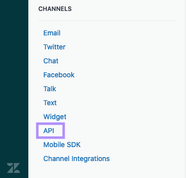 Step 1. Locate the Zendesk Admin interface (gear icon in the sidebar). Select API under Channels: