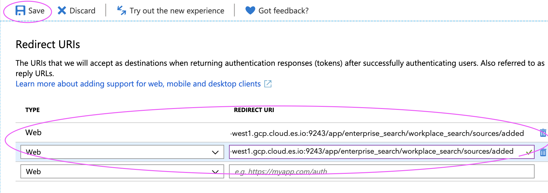 Use the Workplace Search OAuth redirect URL for your deployment.