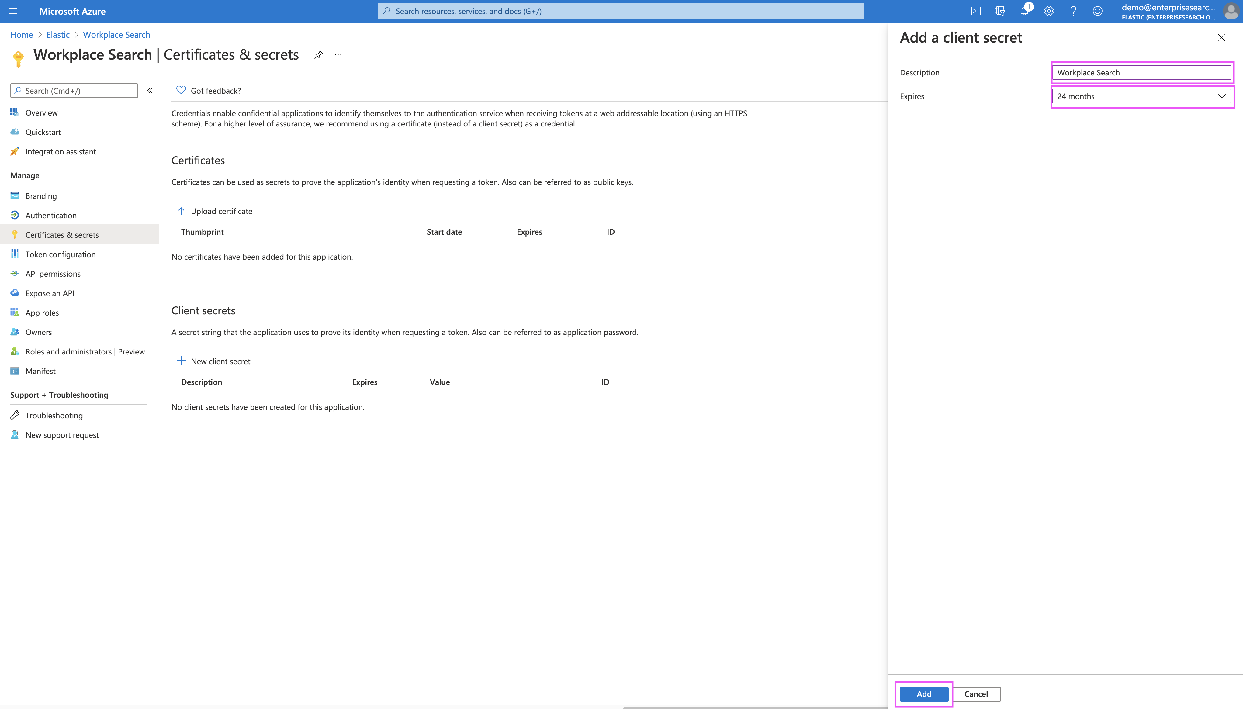 Step 9. Pick a name for your client secret (for example, Workplace Search). Select 24 months as the expiration date: