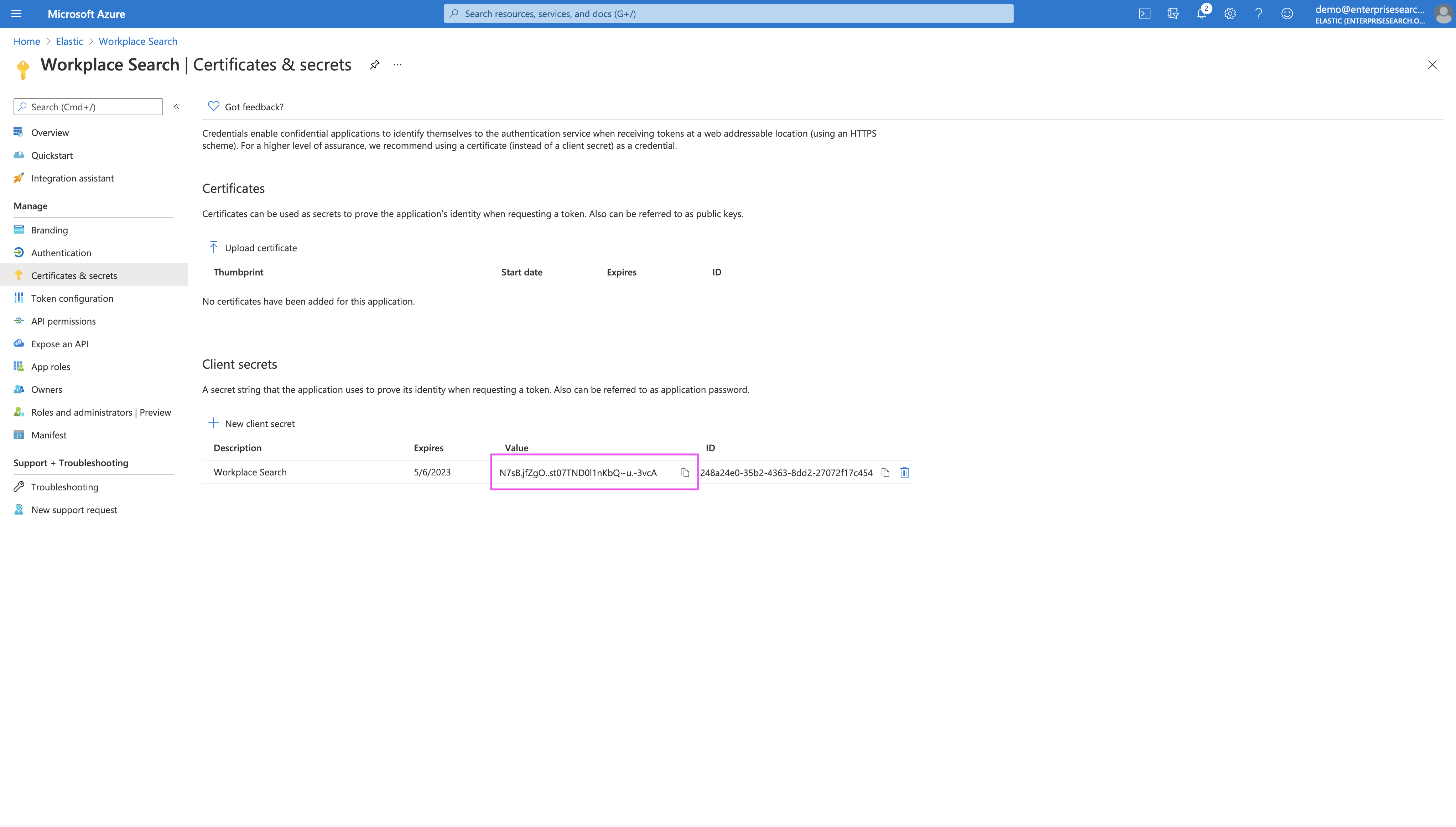 Step 8. Locate the Client Secret by navigating to Certificates & Secrets: