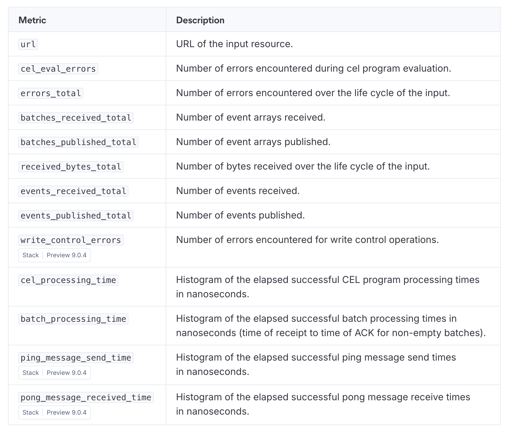 For example, the Streaming Input page includes a table that contains one setting per row and a new setting is added in 9.0.4.