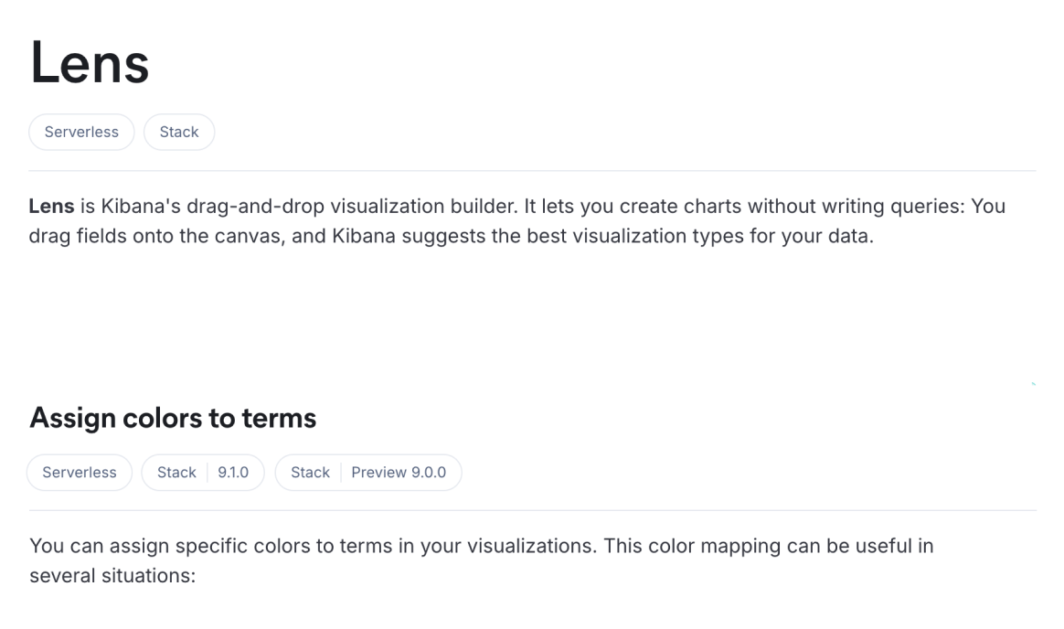 For example, the majority of the content on the Lens page was applicable to both Elastic Stack and to Serverless. One specific section describes functionality that was in technical preview in Elastic Stack 9.0.0 and Serverless at the time Elastic Stack 9.0.0 was released. Then, the functionality became generally available in Elastic Stack in 9.1.0 and shortly before the Elastic Stack 9.1.0 release in Serverless.