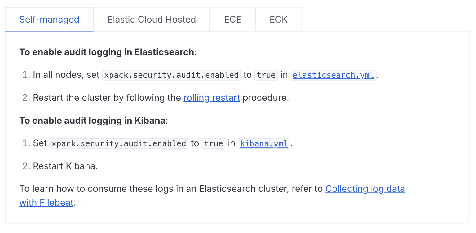 Example: On the Enable audit logging page, we use tabs to show separate ordered lists outlining the workflow for each deployment type.