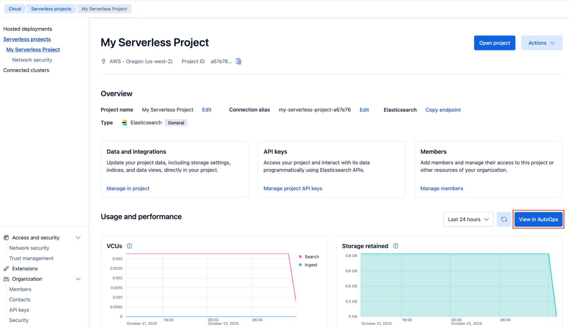 - On the project overview page, in the Usage and Performance section, select View in AutoOps.