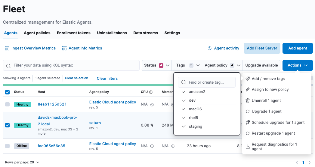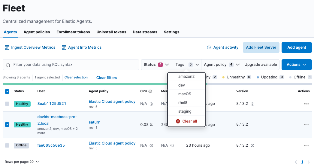 When you install or enroll Elastic Agent in Fleet, you can specify a comma-separated list of tags to apply to the agent, then use the tags to filter the Agents list shown in Fleet.