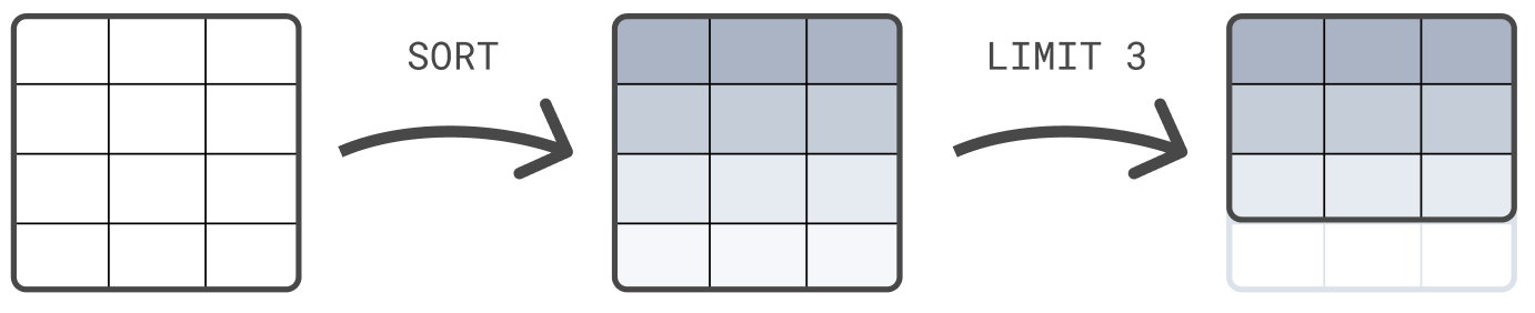 The order of processing commands is important. First limiting the result set to 3 rows before sorting those 3 rows would most likely return a result that is different than this example, where the sorting comes before the limit.