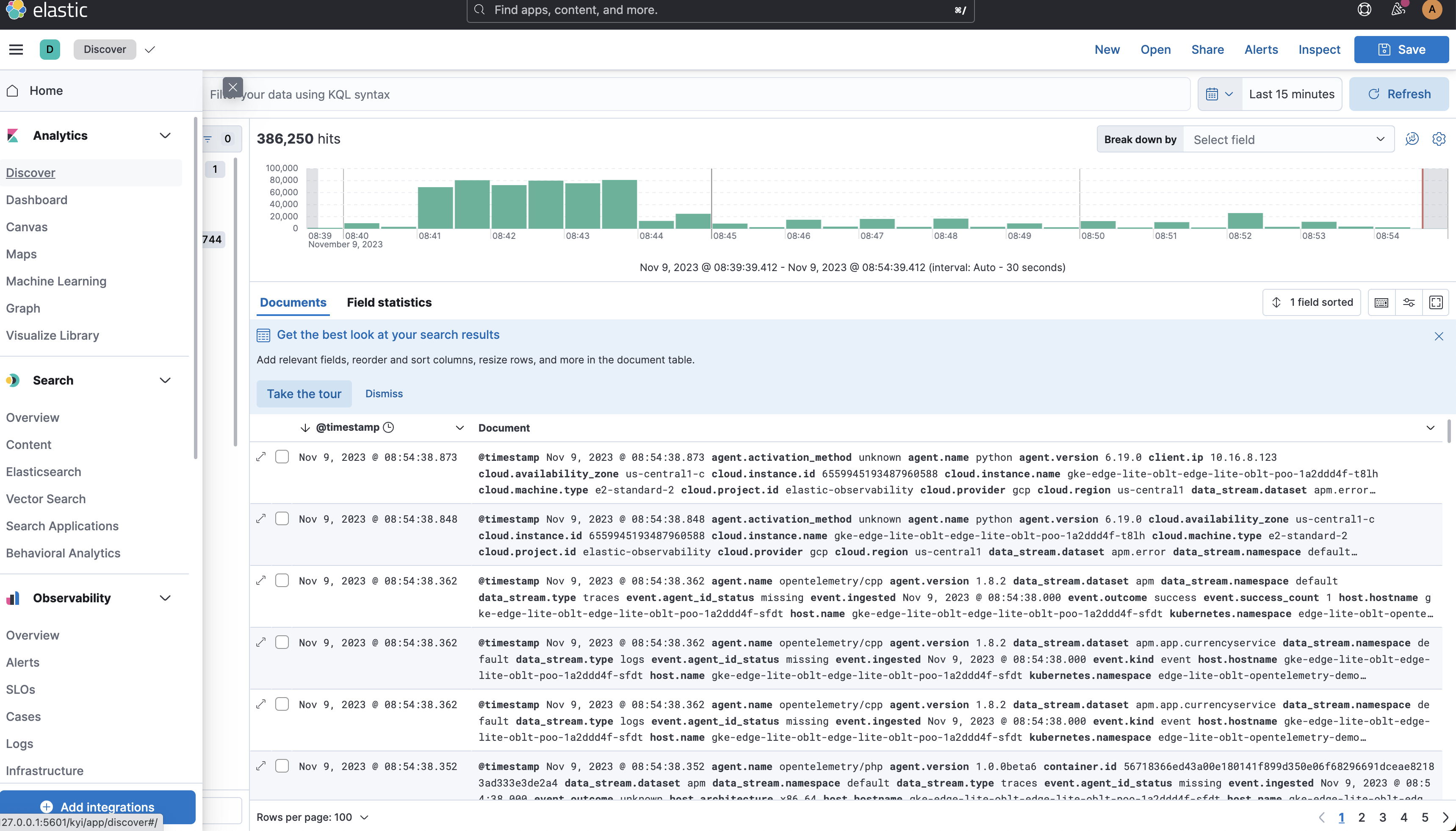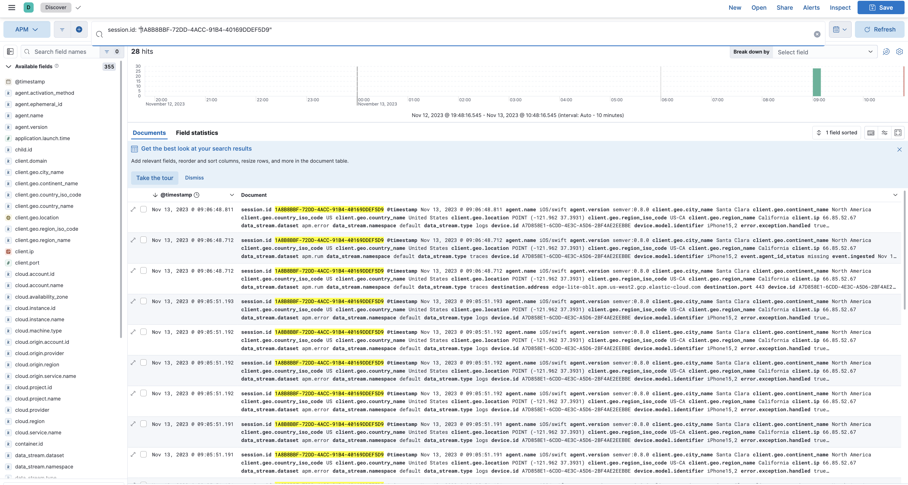 Elastic Mobile APM provides session tracking by attaching a session.id, a guid, to every span and event. This allows for the recall of the activities of a specific user during a specific period of time. The best way recall these data points is using Discover. This guide will explain how to do that.