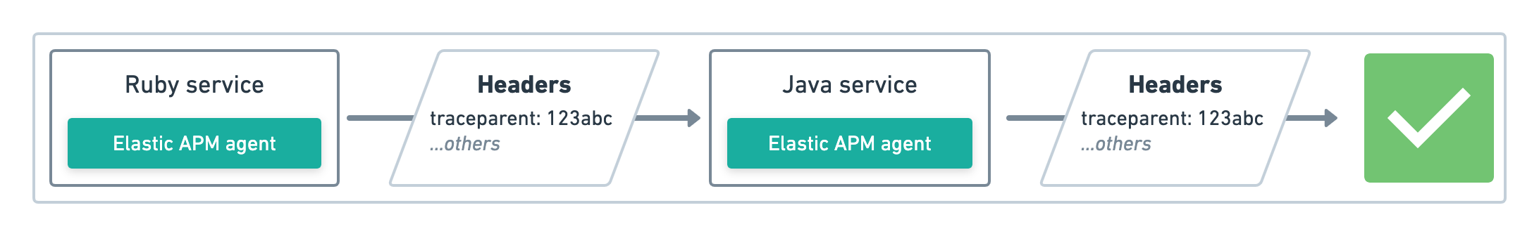 In this example, Elastic’s Ruby agent communicates with Elastic’s Java agent. Both support the traceparent header, and trace data is successfully propagated.