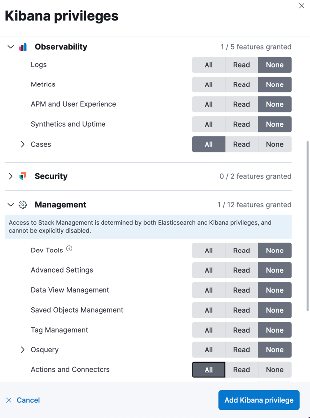 To access and send cases to external systems, you need the appropriate license, and your role must have the Cases Kibana privilege as a user for the Observability feature.