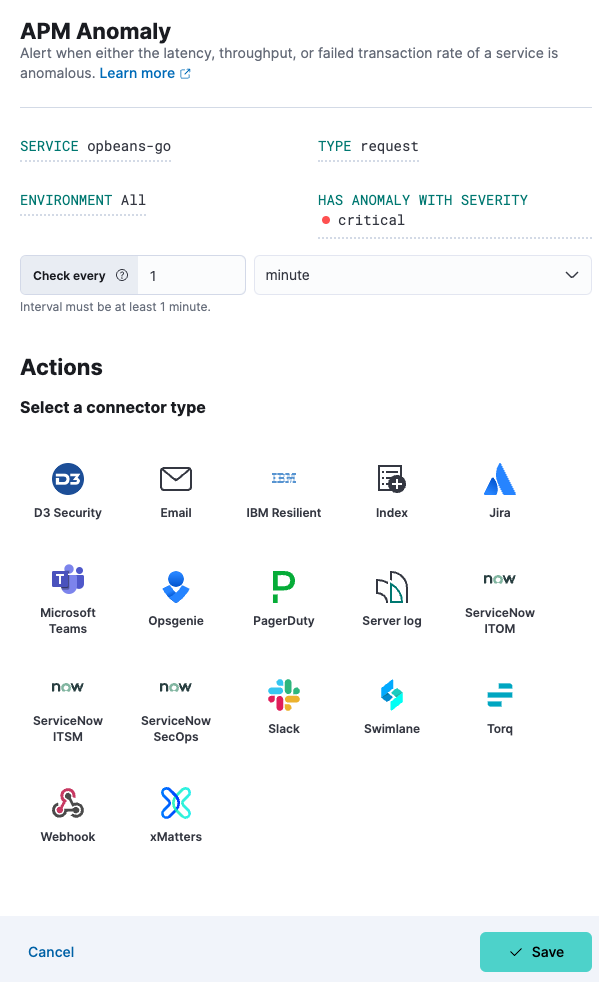 You can create an anomaly rule to alert you when either the latency, throughput, or failed transaction rate of a service is abnormal. Anomaly rules can be set at different levels: environment, service, and/or transaction type. Add actions to raise alerts via services or third-party integrations (for example, send an email or create a Jira issue).