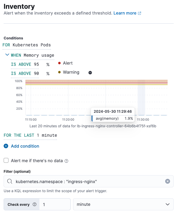 In the following example, Kubernetes Pods is the selected inventory type. The conditions state that you will receive a critical alert for any pods within the ingress-nginx namespace with a memory usage of 95% or above and a warning alert if memory usage is 90% or above. The chart shows the results of applying the rule to the last 20 minutes of data. Note that the chart time range is 20 times the value of the look-back window specified in the FOR THE LAST field.