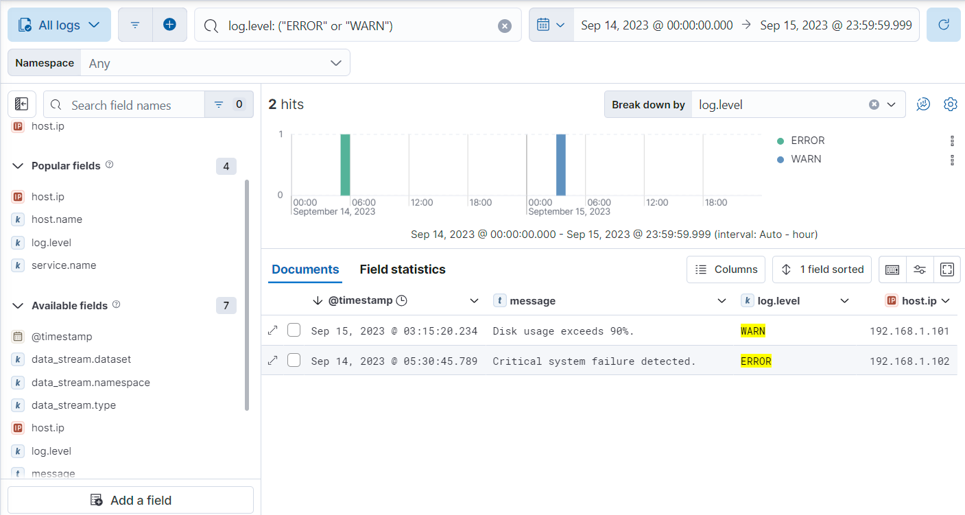 For example, you might want to troubleshoot an issue that happened on a specific date or at a specific time. To do this, use a boolean query with a range query to filter for the specific timestamp range and a term query to filter for WARN and ERROR log levels.