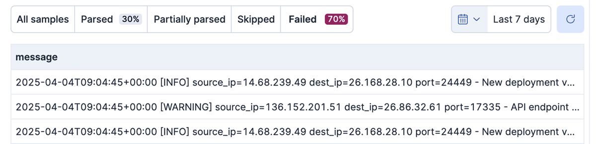 In the following screenshot, the Failed percentage indicates that some messages didn't match the provided grok pattern: