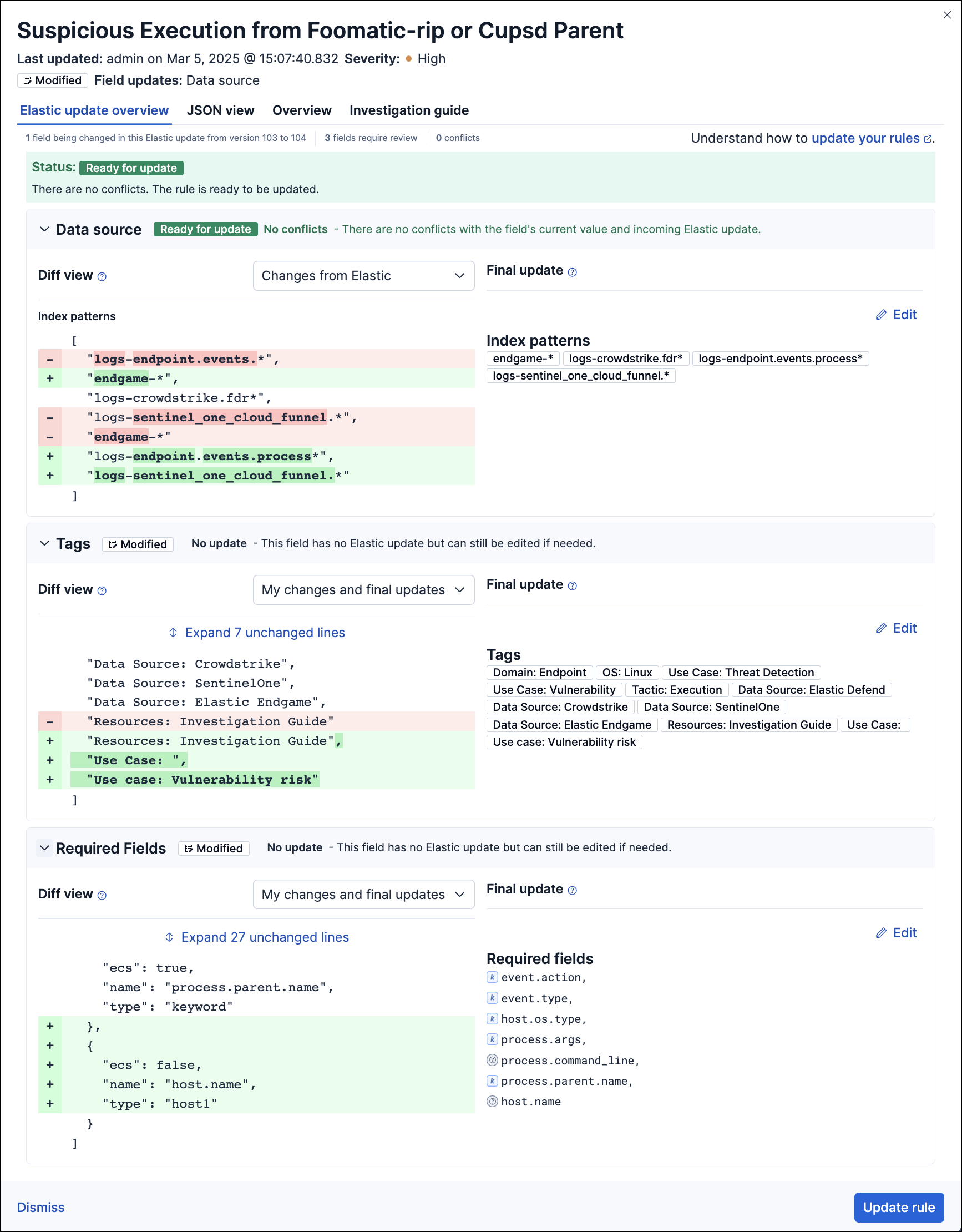 | No update | Displays when the field is not being updated by Elastic, but the current field value differs from the original one. This typically happens when the field's value was changed after the prebuilt rule was initially installed. Further action is not required for the field. It is ready to be updated. Tip: You can still change the final field update, if needed. To do so, make your changes in the Final update section and save them. |