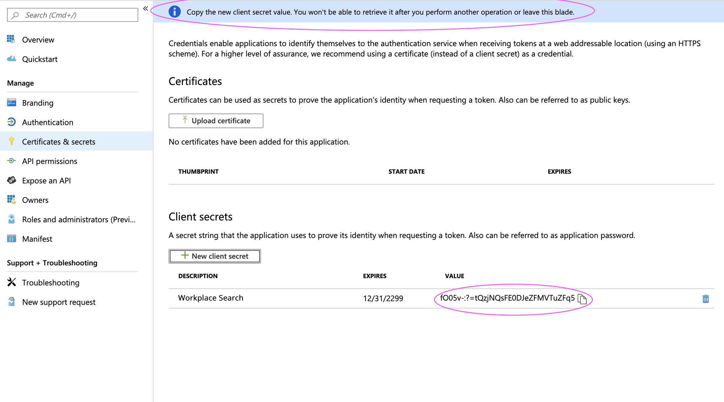 Step 8. Locate the Client Secret by navigating to Certificates & Secrets: