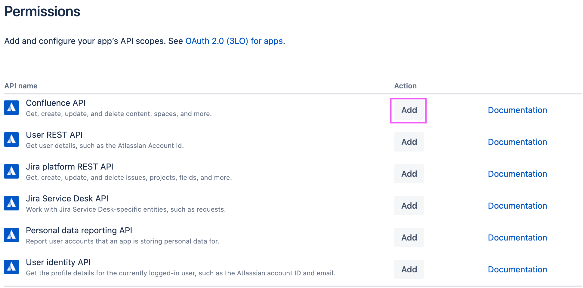 Step 5. Create API access and set the right permission level. In the sidebar, click Authorization, locate OAuth 2.0 (3LO), and click Add: