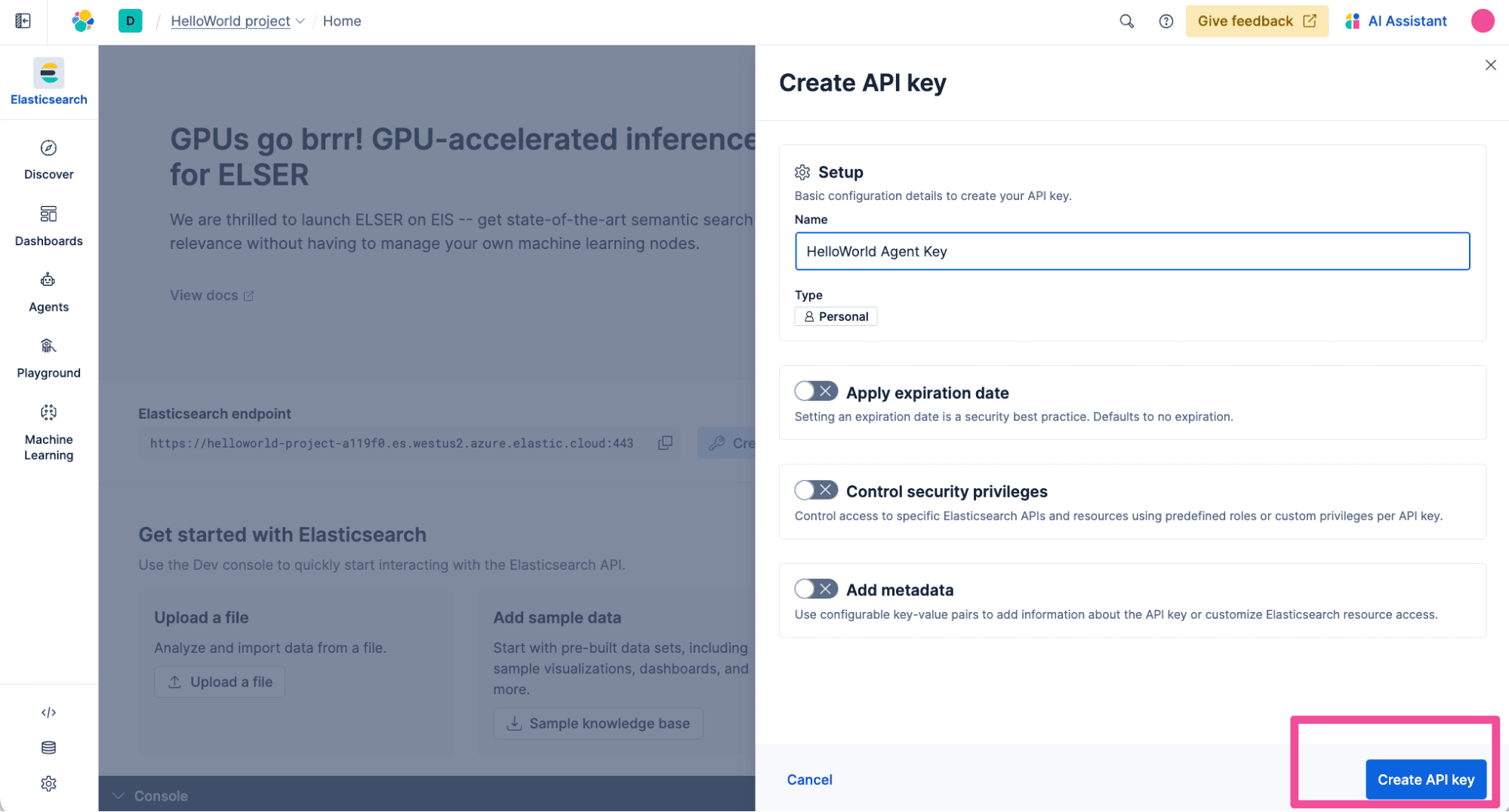 The next step on this walkthrough journey is to create an agent that can utilize the data stored in Elastic.