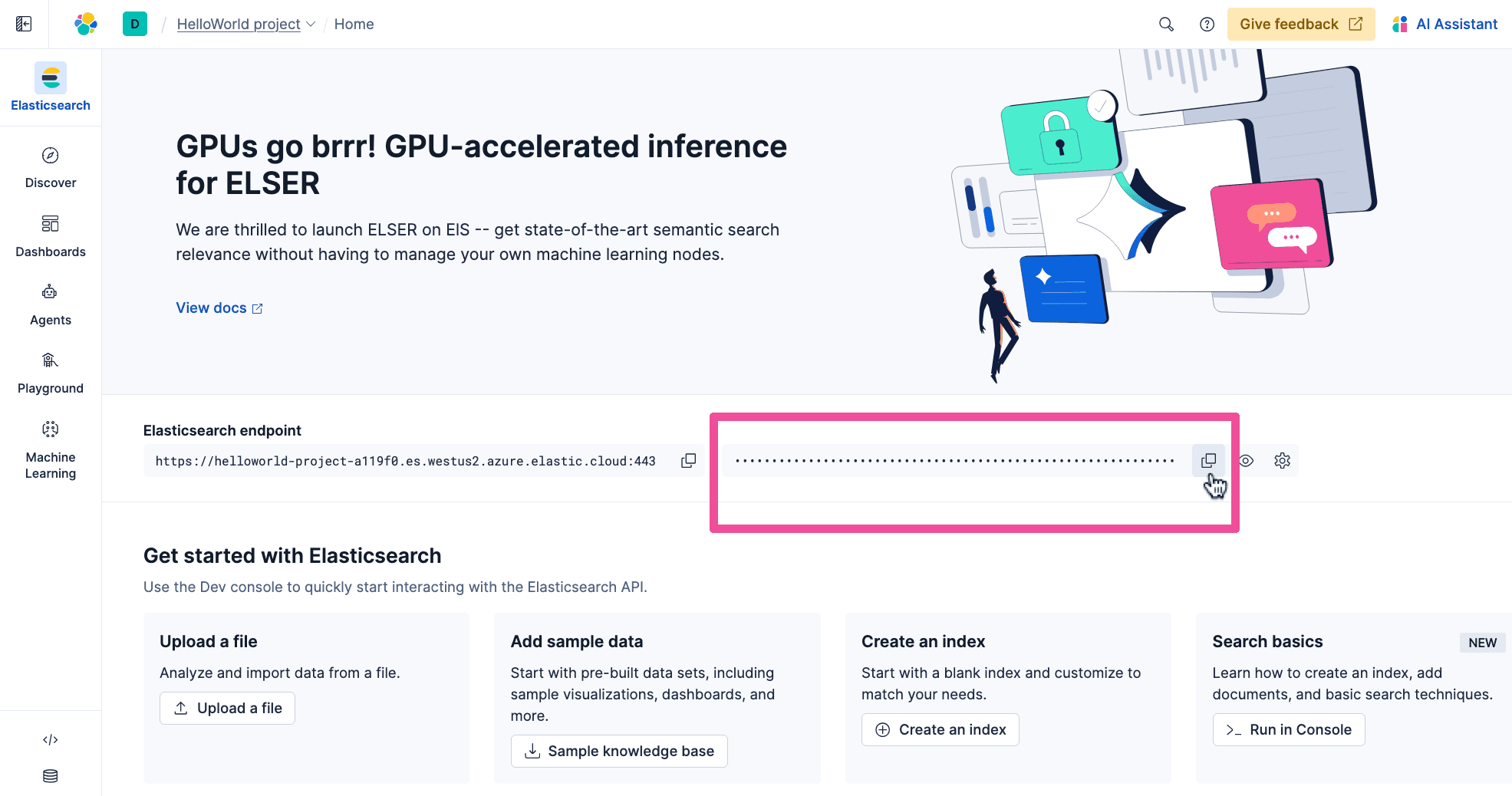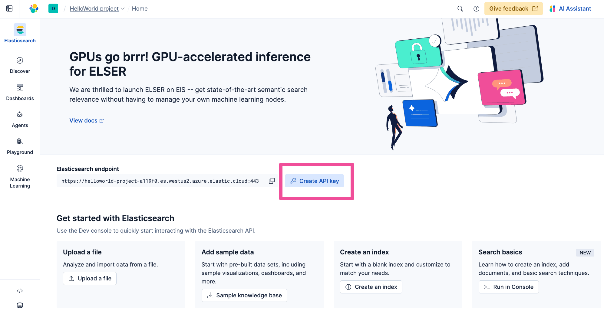 The next placeholder text to replace in the .env file is <YOUR-ELASTIC-API-KEY>. We’ll replace it with an actual API Key from your Elastic project. Back in your Elastic project, click Elasticsearch in the navigation menu.