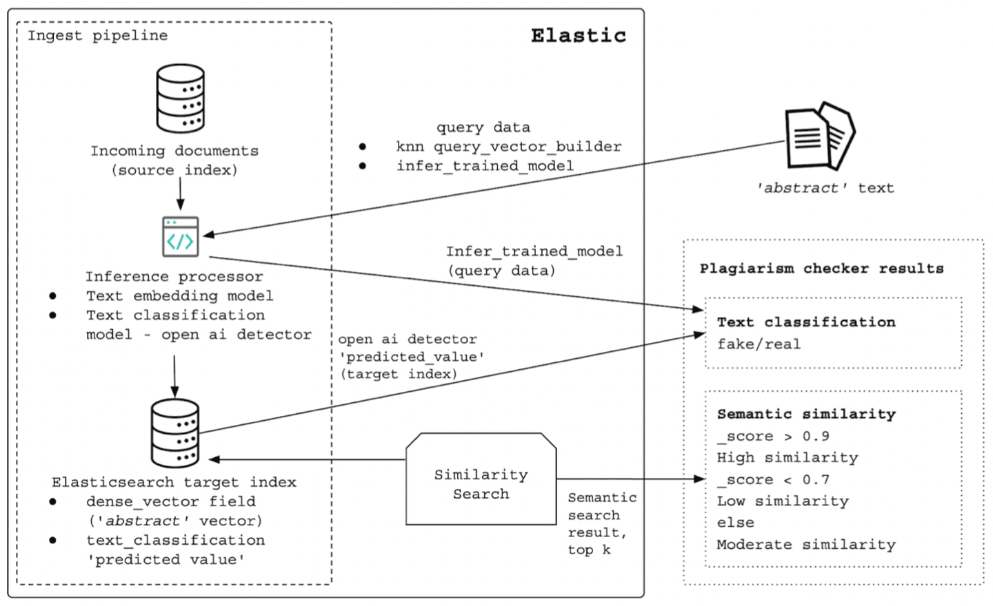 This is demonstrated with Python examples, where we utilize a dataset from SentenceTransformers containing NLP-related articles. We check the abstracts for plagiarism by performing 'semantic textual similarity' considering 'abstract' embeddings generated with a text embedding model previously imported into Elasticsearch. Additionally, to identify AI-generated content — AI plagiarism, an NLP model developed by OpenAI was also imported into Elasticsearch.