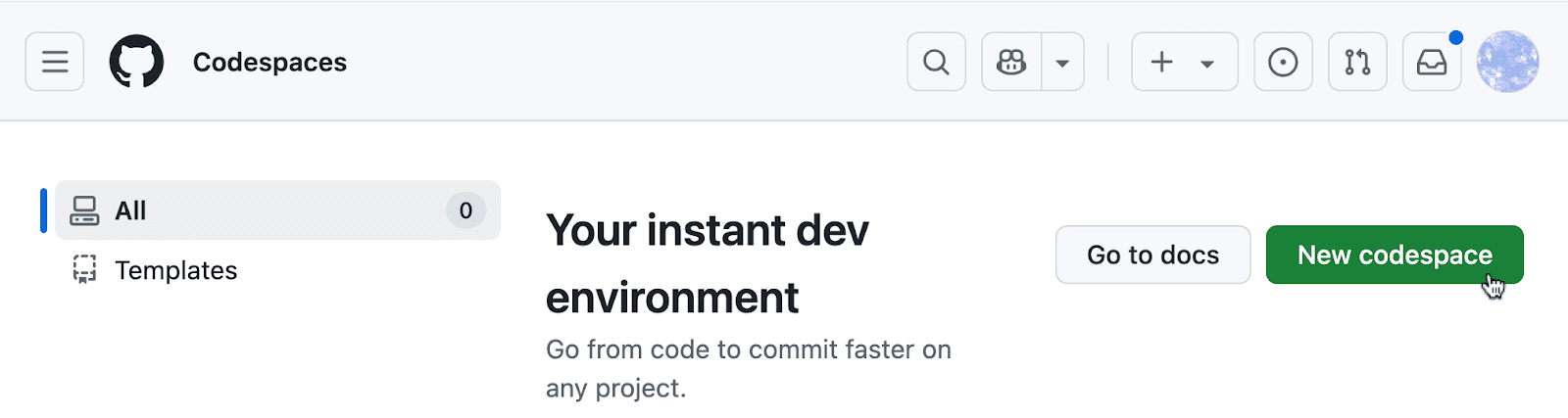 Begin by cloning the code for the example application. You can do this in GitHub Codespaces, which provides a way to clone and run applications. Click New Codespace.